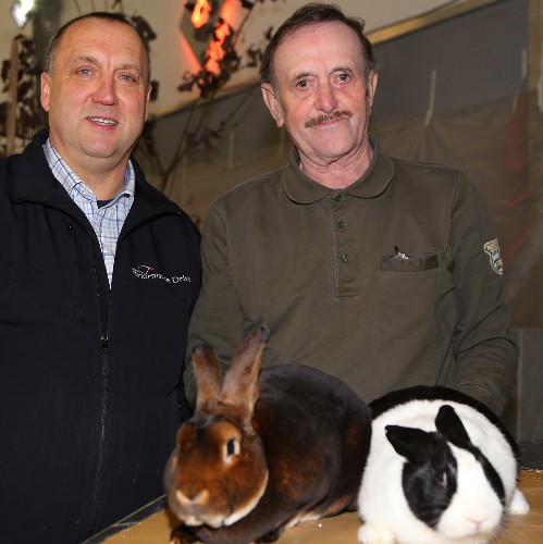 Günter Lampert aus Eutingen (rechts) mit seinem hoch dotierten Kreismeister, einem Holländer-Kaninchen schwarz-weiß, und Uwe Reichenbach (li.) aus Niefern-Öschelbronn mit Castor Rex, ein Kurzhaarkaninchen, das mit 97,5 Punkten ebenfalls zu den besten Tieren. (Foto: ufa)