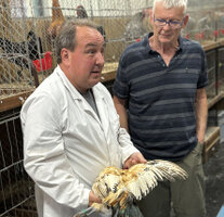 Ein Tier nach dem anderen nehmen die Preisrichter aus den Käfigen, die in der Nöttinger Panoramahalle über- und nebeneinander stehen. Kaninchen haben es sich in ihnen ebenso gemütlich gemacht wie Hühner und Tauben, alle in den unterschiedlichsten Rassen und Farbenschlägen. Wenn sie die Tiere in Augenschein nehmen, achten die Richter auf jedes Detail, um ihren Besitzern eine qualifizierte Rückmeldung geben zu können. Ihre Einschätzung ist viel wert, gerade mit Blick auf die Lokalschauen, Kreisschauen und anderen Ausstellungen, die im Herbst und im Winter anstehen. Schon seit vielen Jahren bieten die beiden Kreisverbände der Kleintierzüchter vor ihrer Herbstversammlung eine Tierbesprechung an, die den teilnehmenden Züchtern eine Orientierung geben soll. „Das hat sich bewährt und ist inzwischen Tradition“, sagt Jörg Hess. Der Kreisvorsitzende der Rassekaninchenzüchter weiß, dass man bei kleinen Fehlern unter Umständen noch gegensteuern kann. Etwa beim Gewicht oder beim Pflegezustand.