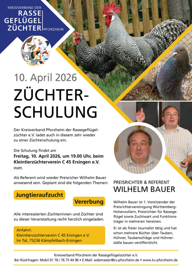 Der Kreisverband Pforzheim der Rassegeflügelzüchter lädt alle interessierten Züchterinnen und Züchter herzlich zur diesjährigen Züchterschulung nach Ersingen ein. Die Veranstaltung bietet eine wertvolle Gelegenheit, sich rund um die Themen Jungtieraufzucht und Vererbung weiterzubilden und sich mit Gleichgesinnten auszutauschen.